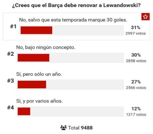 莱万与巴萨合同明夏到期,《马卡》报就巴萨是否应该与之续约发起网络调查,共9488名球迷参与投票,有30%认为无论如何都不续约—— ①不,除非他本赛季打进30球 31% ②不,任何情况下都不 30% ③是,但只续一年 27% ④是,续约好几年 12% 本季迄今,莱万为巴萨出场9次打入4球,其中4次首发,共出场431分钟。据西媒报道,莱万首选留在巴萨,至少留在欧洲,暂不考虑前往沙特、美国。而如果莱万离队,巴萨希望免签弗拉霍维奇,而马竞、米兰、尤文有意免签莱万。