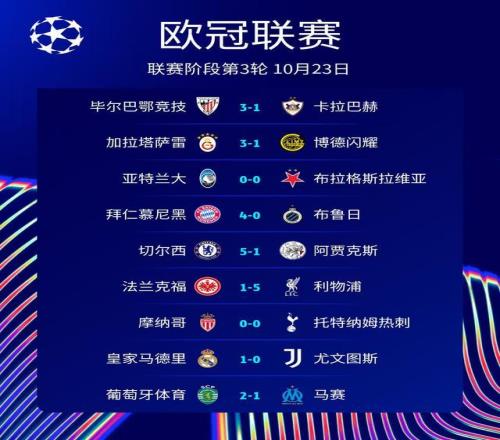 至此,本赛季欧冠联赛阶段第3轮第2天的9场比赛战罢,结果分别为:毕尔巴鄂竞技3-1卡拉巴赫、加拉塔萨雷3-1博德闪耀、亚特兰大0-0布拉格斯拉维亚、拜仁慕尼黑4-0布鲁日、切尔西5-1阿贾克斯、法兰克福1-5利物浦、摩纳哥0-0托特纳姆热刺、皇家马德里1-0尤文图斯、葡萄牙体育2-1马赛。