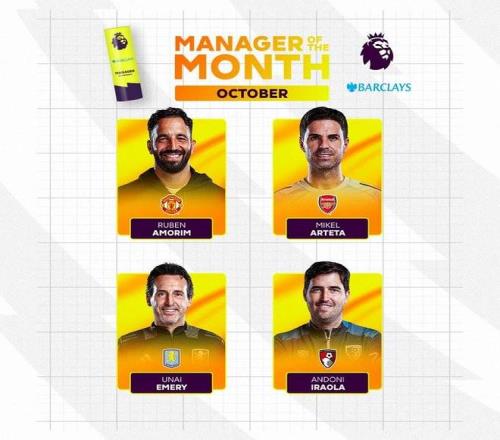 北京时间10月30日,官方消息,英超10月最佳主帅候选名单公布,分别是阿尔特塔、阿莫林、埃梅里和伊劳拉。