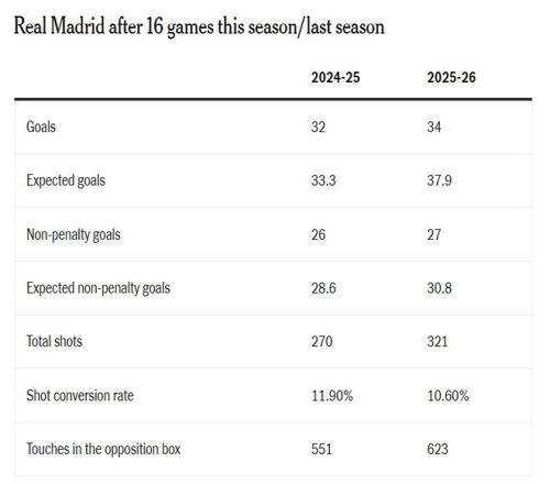如下表所示,实际上今年在阿隆索的带领下,皇马产生的预期进球值比去年更高,总进球和非点球进球也更多。但他们的射门转化率却下降了,尽管在对手禁区内的触球次数和射门次数都比上赛季多。