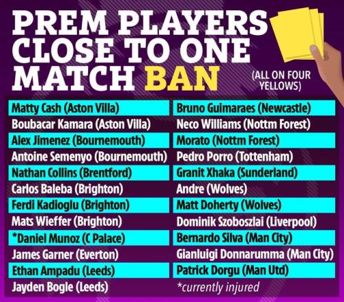 在本周末圣诞前的最后一轮比赛前,有23名英超球员距离因累计五张黄牌停赛、从而在圣诞节当天与家人休假仅一步之遥。