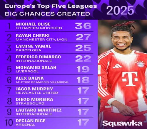2025年即将结束,知名数据机构Squawka统计了五大联赛本年度创造绝佳机会数据,拜仁攻击手奥利塞高居榜首,曼城中场谢尔基位列次席。